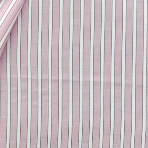 This cotton dobby features delicate pink stripes woven into a refined textured pattern. Ideal for sophisticated garments that combine elegance, comfort, and timeless style.