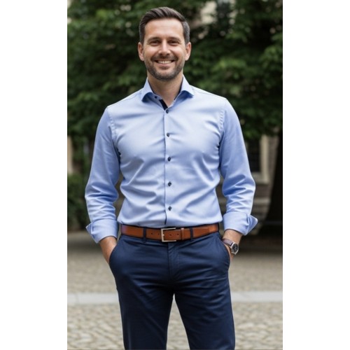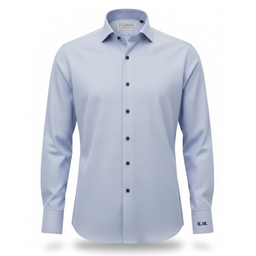 A Light Blue Cotton Shirt crafted from soft twill fabric, featuring striking navy buttons for a contemporary, polished look. Comfortable and stylish for both work and casual occasions.