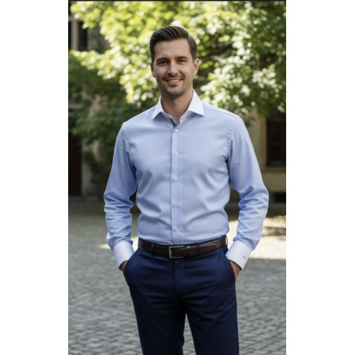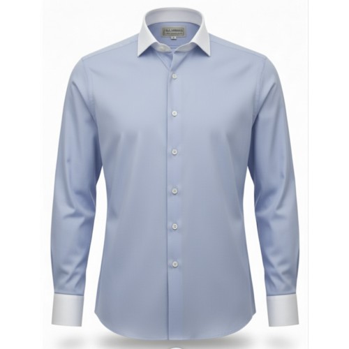 A refined Light Blue Cotton Shirt accented with crisp white outer collar and cuffs. Soft, breathable cotton and clean contrast details create a sharp, elevated look for work or smart-casual wear.