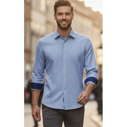A lightweight, finely textured linen shirt in a soft light-blue tone—perfect for warm weather and effortless style. Designed with a clean modern collar and subtle woven detailing, it offers a relaxed yet refined look. The navy contrast inner cuffs add a sophisticated touch, making this shirt ideal for both casual outings and smart summer occasions.