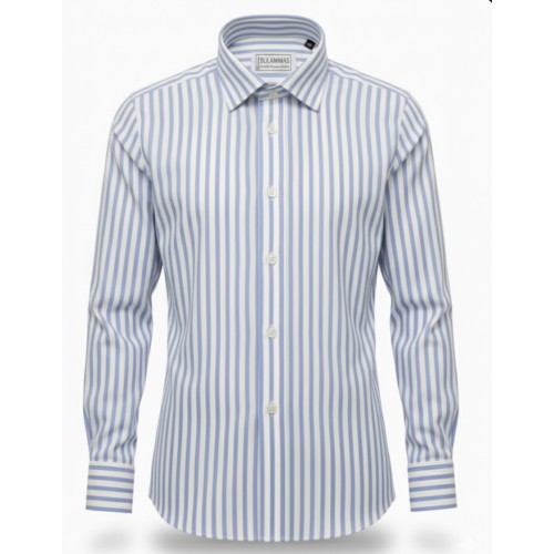 This light blue bold-stripe cotton shirt delivers a crisp, confident look perfect for both business and smart-casual styling. Crafted from smooth, breathable cotton, it offers structure while remaining comfortable throughout the day. A timeless stripe pattern makes it an effortless wardrobe staple.