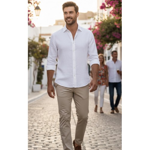 Experience effortless style and comfort with this classic white linen shirt, crafted from premium, breathable linen. Lightweight and naturally airy, it’s designed to keep you cool while maintaining a refined, polished look. The clean silhouette, crisp collar, and subtle texture make it versatile enough for both relaxed daytime wear and elevated evening outings. Perfect for warm weather, vacations, and timeless everyday elegance.